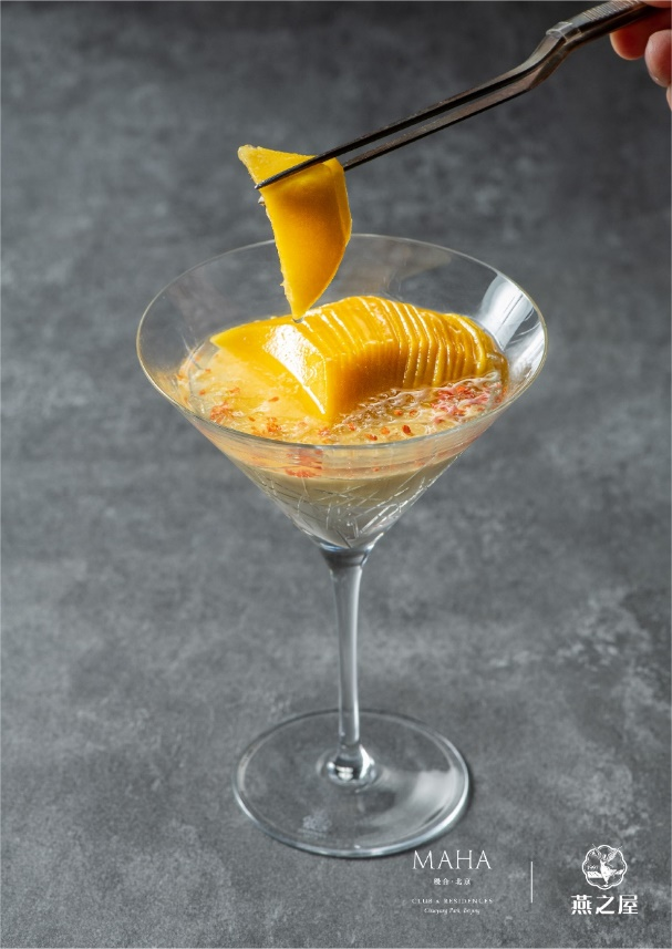 秋葵黃魚燕窩羹,燕窩經(jīng)凈水浸沐6小時,換水滌塵,撕作雪絲隔水輕燉;黃魚淋開水封鮮,煎至金黃生香,搗碎入滾水熬至濃白;秋葵片灼水,如玉簪點入羹中。這一盅融深海之鮮、燕窩之潤、青蔬之清——沿襲古法,讓食養(yǎng)同源的美味在舌尖化開。發(fā)酵酸湯龍蝦趴燕窩汁,龍蝦肉冷腌15分鐘,裹上特調(diào)漿粉炸出金黃蜂巢脆衣,咬下時“咔嚓”聲如秋葉碎響。番茄經(jīng)自然發(fā)酵成琥珀酸湯,澆淋現(xiàn)燉燕窩汁——酸鮮激蕩中,燕窩柔滑如綢緞?chuàng)徇^舌尖,是主廚獻(xiàn)給味覺的冒險詩篇。芒果酒釀桂花蜜蛋糕配新鮮芒果及燕窩:“燕窩需隔水輕蒸,裹住桂花蜜的魂。”主廚將酒釀熬作凝脂奶凍,托起卡曼橘芒果慕斯的俏皮酸香。頂層燕窩如琉璃凍雨,新鮮芒果是點睛明月。撒入桂花,取“蟾宮折桂”的好兆頭。當(dāng)瓷勺探底——酒釀的醇厚、慕斯的輕盈、燕窩的滑潤在口中共譜秋月的詩篇。