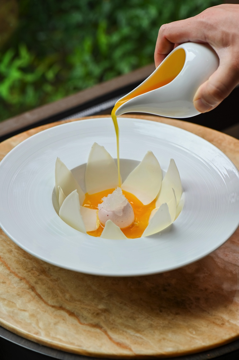 玉蘭花開映燕盞,是一道展現(xiàn)廚藝美學(xué)的匠心之作。白巧克力制成花瓣,包裹草莓慕斯花心,在溫潤芒果汁液的澆淋下仿若漸次綻放。燕窩藏于花蕊,細膩口感與靈動形態(tài)共同演繹出食境合一的東方意境。