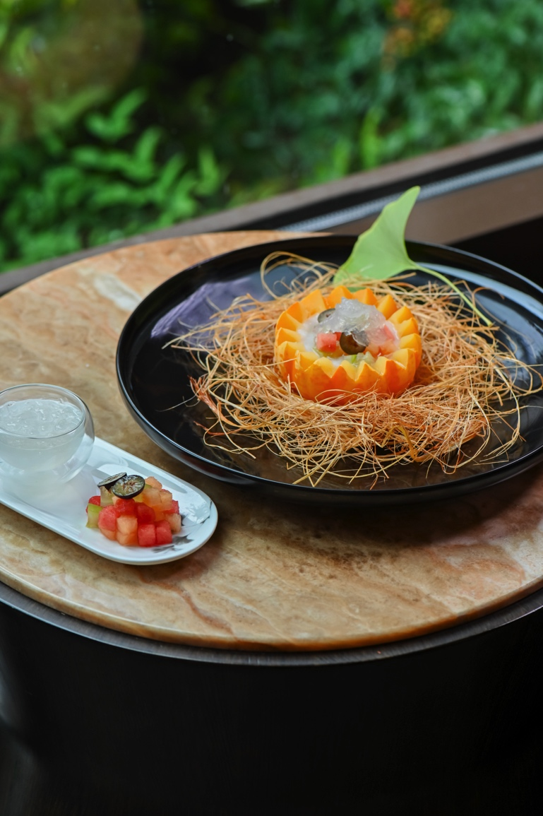 金巢玉露應(yīng)燕歸,取形制優(yōu)美的菊瓜為器,蒸至甘軟后注入香濃椰奶,綴入繽紛鮮果與晶瑩燕窩。瓜體的清甜與椰韻的馥郁相融,燕絲穿梭其間,營造出豐富而和諧的味覺體驗,寓意金秋歸巢,溫潤養(yǎng)人。